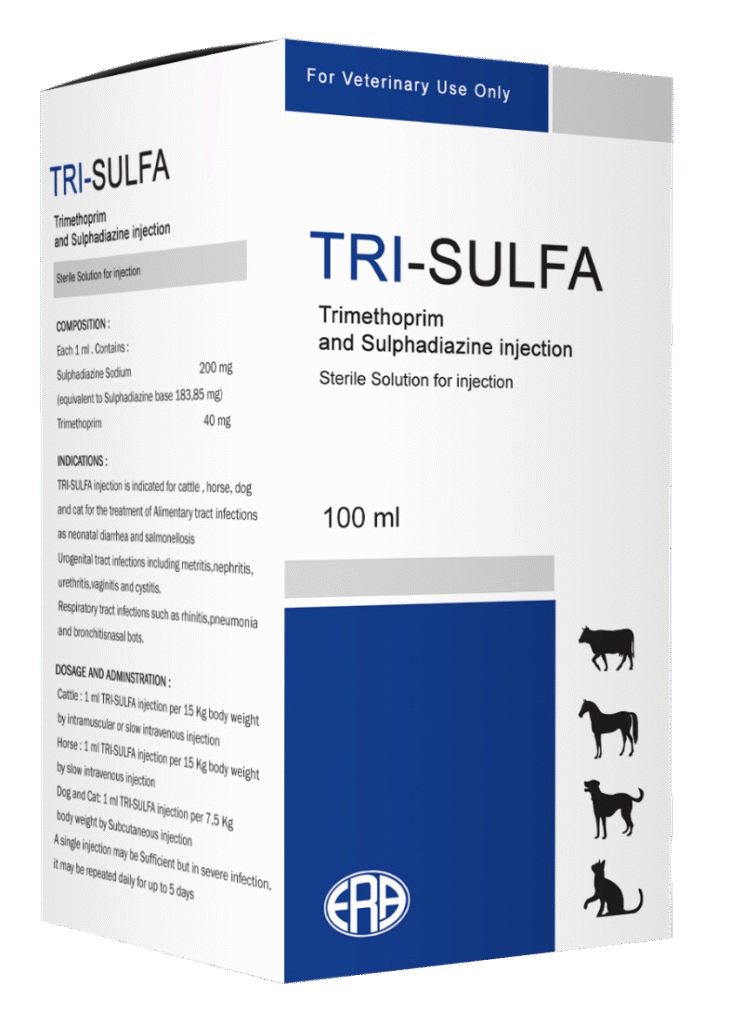 TRI-SULFA injection is indicated for cattle, horse, dog and cat for the treatment of